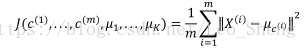 K-均值最小化问题,是要最小化所有的数据点与其所关联的聚类中心点之间的距离之和,因此 K-均值的代价函数(又称畸变函数 Distortion function)为: