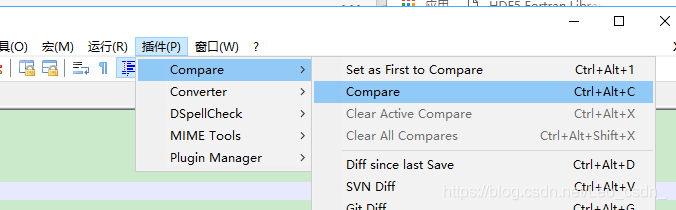无论采用1还是2的方法,安装完成后,再次选择‘插件’,出现Compare选项(我之前的图片中已经出现过了),点开后继续选择后面列表中的Compare功能即可使用文本对比功能