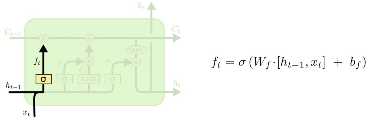下面给出了LSTM的遗忘门示意图,它根据 h t − 1 h_{t-1} ht−1和 x t x_{t} xt决定忘记细胞状态的哪些值。