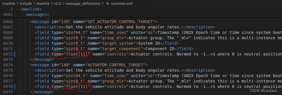 步骤同上,在mavlink/include/mavlink/v2.0/message_definition/文件夹下找到common.xml文件,分别将“SET_ACTUATOR_CONTROL_TARGET”和“ACTUATOR_CONTROL_TARGET”这两块对应的控制通道数改为11