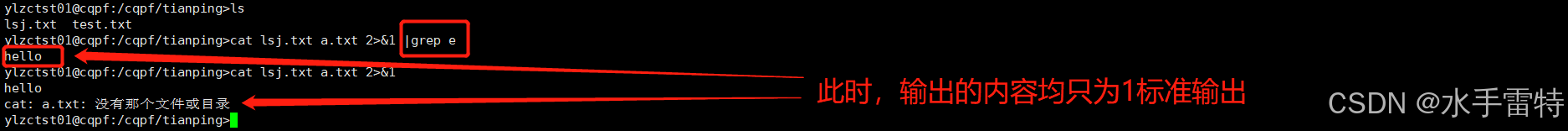 解析:其中,标准输出->grep没搜索到,无输出;标准错误输出->因为1>&2,输出hello