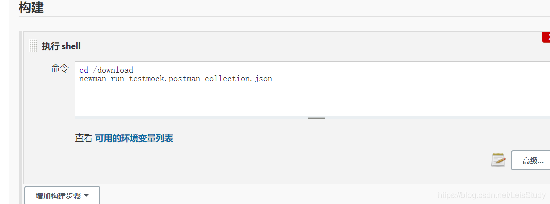 4、在jenkins配置构建选项中,选择shell,执行newman命令