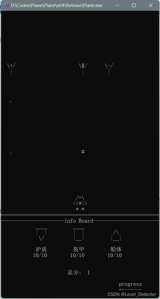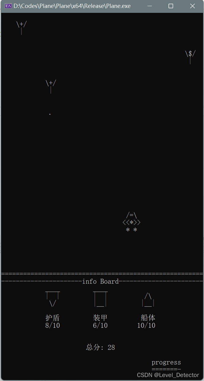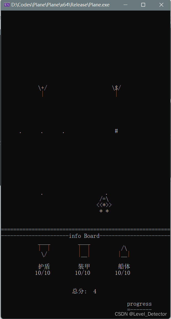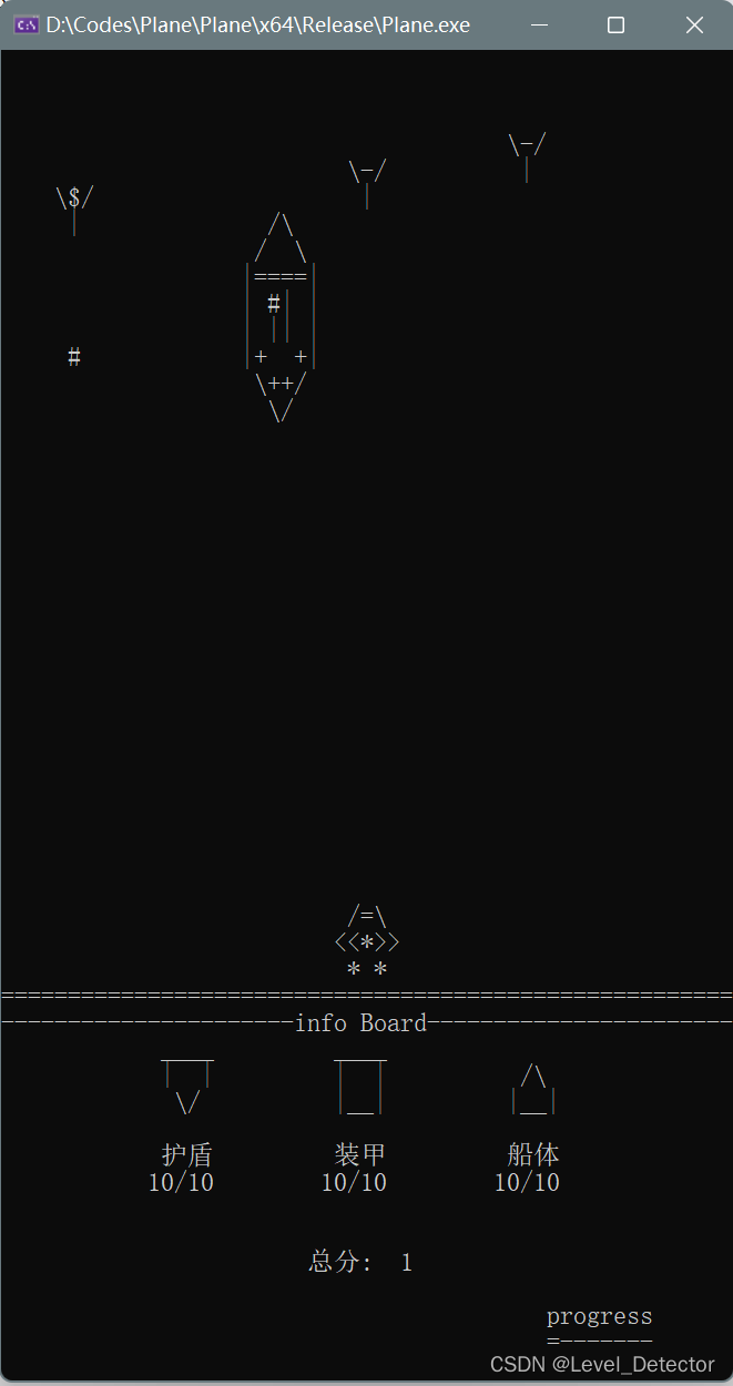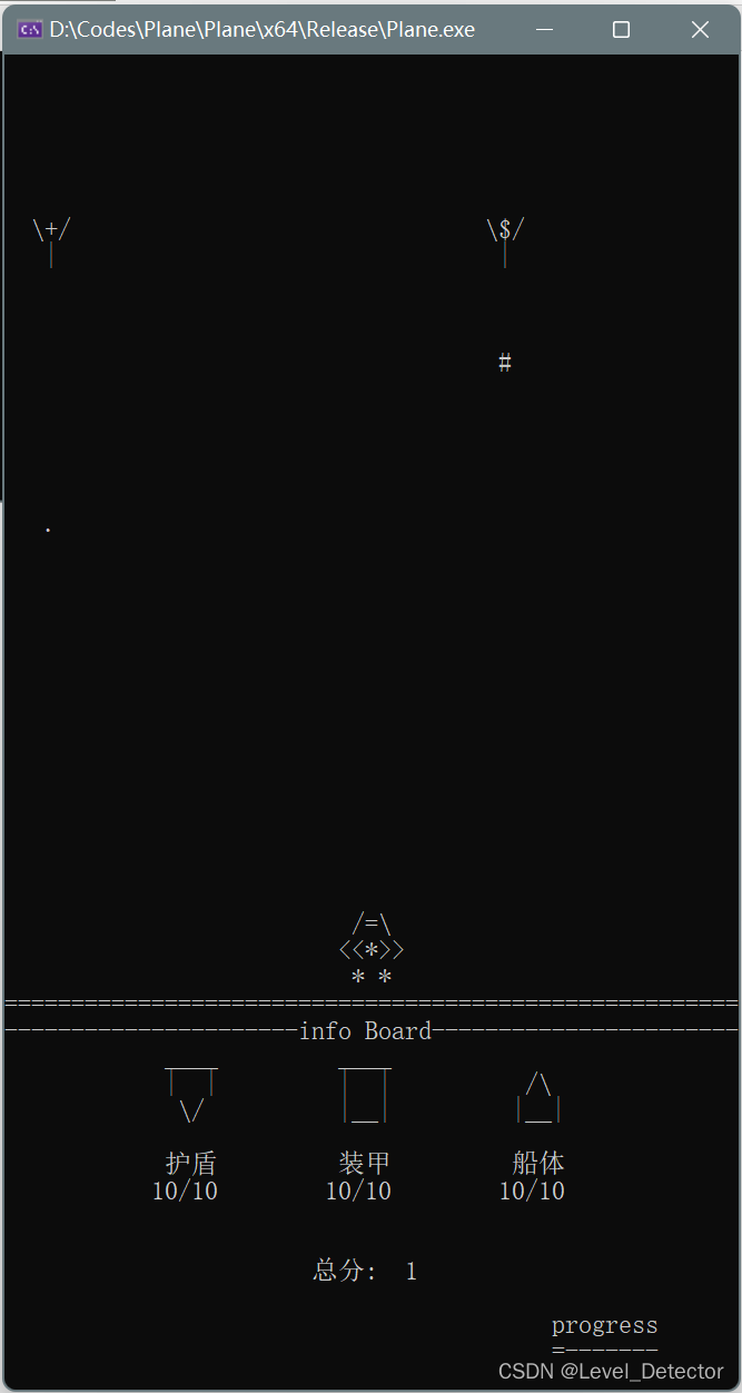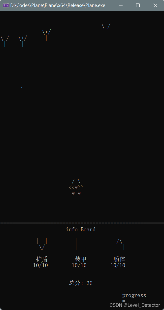- 进度条,组合使用”=” , ”-”实现,当前进度由当前攻击波已摧毁的的敌机决定。