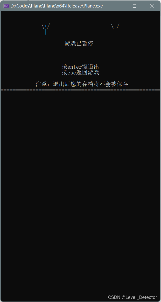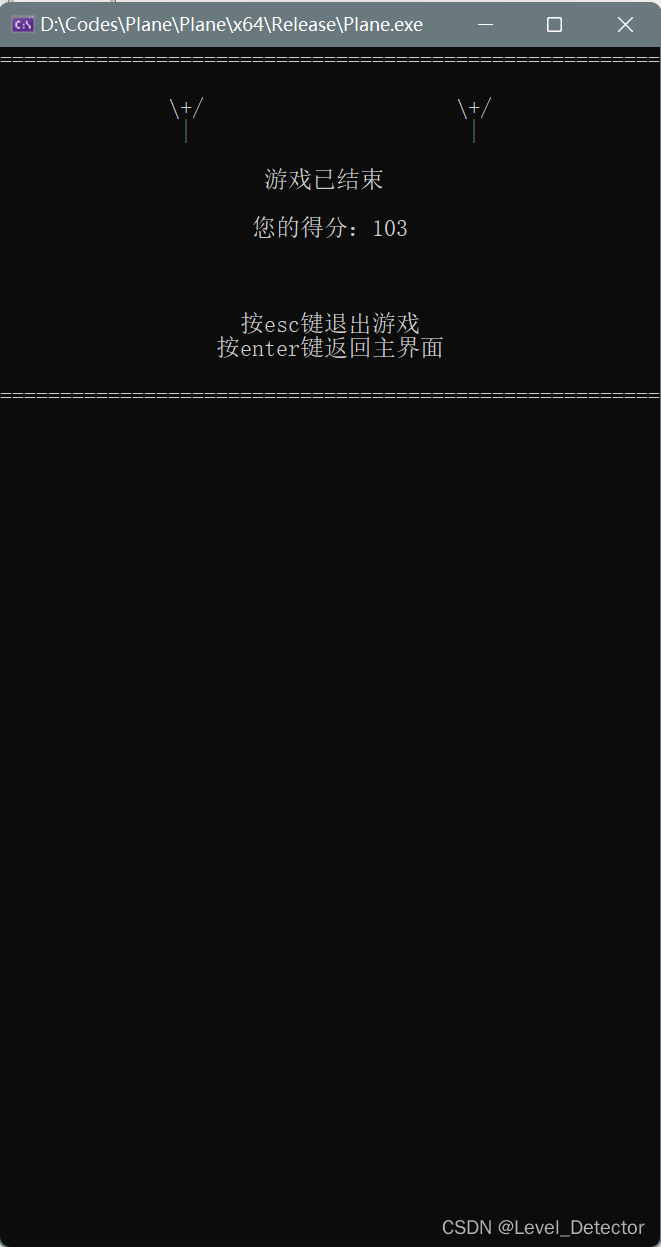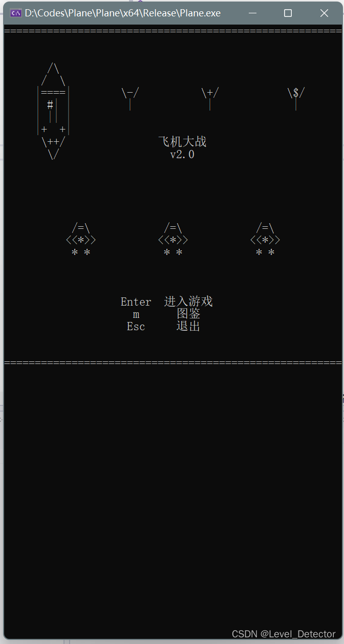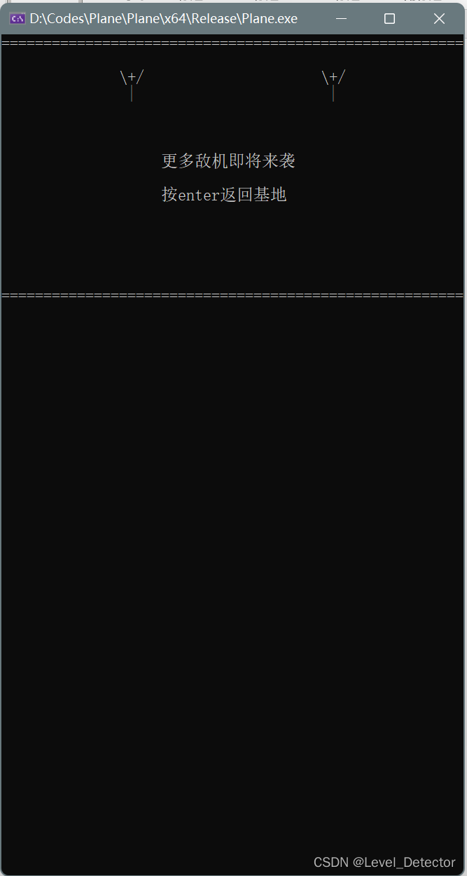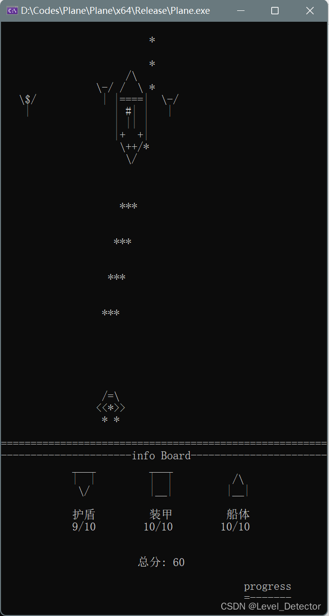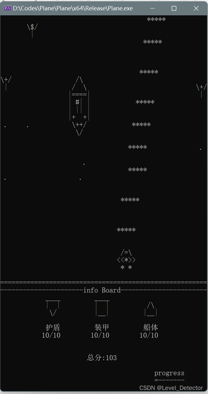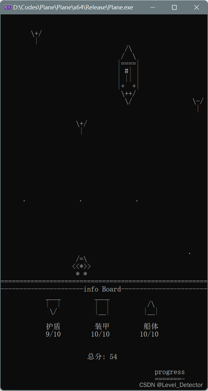 - 进度条,组合使用”=” , ”-”实现,当前进度由当前攻击波已摧毁的的敌机决定。