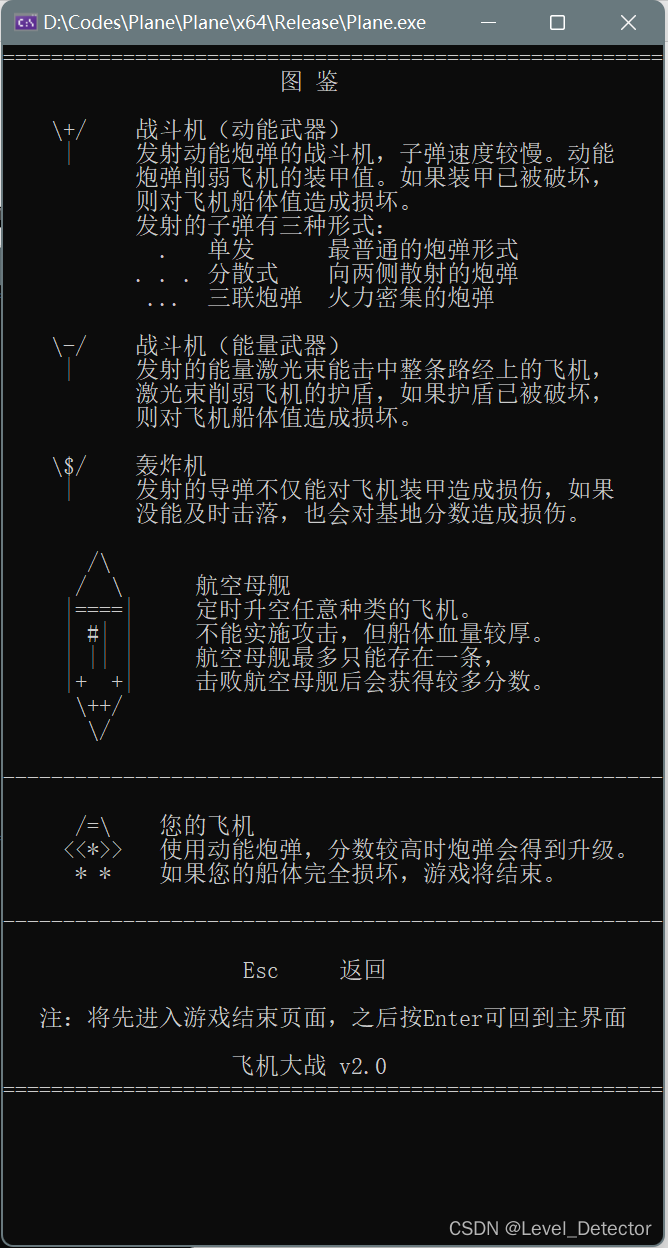 - 在控制台的基础上完善UI设计,增加图鉴界面以帮助新手玩家;完善开始、难度选择、暂停、维修、结束等界面间的切换逻辑;在战场下方显示我方飞机的状态面板、总得分和本轮攻击进度条。