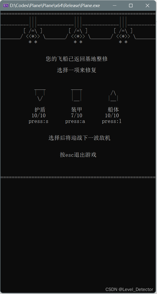 - 使用两个变量控制本次攻击波的总敌机数和已摧毁的敌机数,总敌机数是受到当前难度控制。添加两次攻击波之间的暂停界面,在该界面中可以选择护盾/装甲/船体中的一项进行修复。