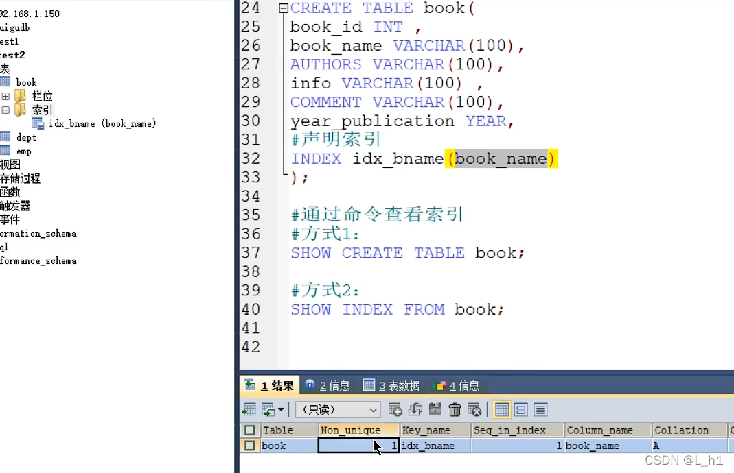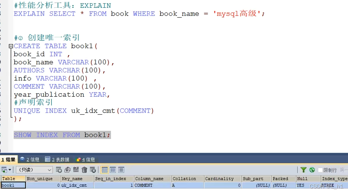 根据查询到地结果显示,表名是table,非唯一字段,索引名叫idx_name,数量是1,单列索引,要是联合索引地话就不是1了,对应地字段是book_name。之后用book_name索引查询数据就会非常高效,非常省时。
