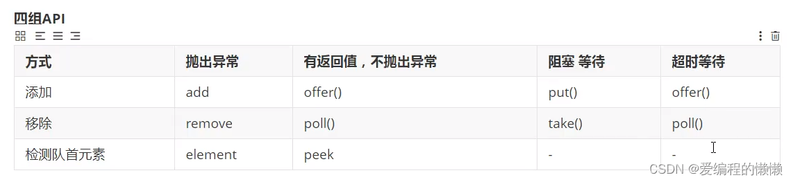 put(E element):将元素放入队列。如果队列已满,该方法会阻塞当前线程,直到有空间可用或线程被中断。BlockingQueue<E> queue = new SomeBlockingQueue<>(); queue.put(element);take():从队列中获取并移除一个元素。如果队列为空,该方法会阻塞当前线程,直到有元素可用或线程被中断。BlockingQueue<E> queue = new SomeBlockingQueue<>(); E element = queue.take();offer(E element, long timeout, TimeUnit unit):将元素放入队列,如果队列已满,则在指定的时间内等待空间可用。如果在超时时间内仍然没有空间可用,该方法会返回false。BlockingQueue<E> queue = new SomeBlockingQueue<>(); boolean success = queue.offer(element, 1, TimeUnit.SECONDS);poll(long timeout, TimeUnit unit):从队列中获取并移除一个元素,如果队列为空,则在指定的时间内等待元素可用。如果在超时时间内仍然没有元素可用,该方法会返回null。BlockingQueue<E> queue = new SomeBlockingQueue<>(); E element = queue.poll(1, TimeUnit.SECONDS);这些API使阻塞队列在多线程环境中更容易使用。生产者线程可以使用