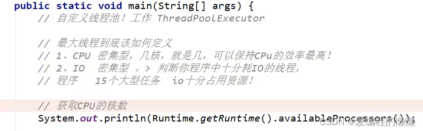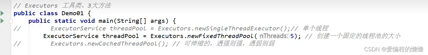 Executors类提供的静态方法之一,或者直接使用ThreadPoolExecutor类来创建线程池。ExecutorService executor = Executors.newFixedThreadPool(5); // 创建固定大小的线程池 ```