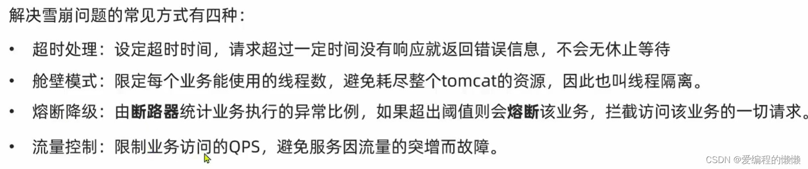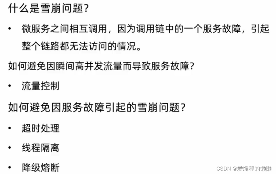 解释:如果服务A依赖与服务B和服务C,当服务C发生错误时,服务A也会因为服务C的错误无法继续运行,导致后面的程序不能够再次运行,这样可以理解未雪崩!
