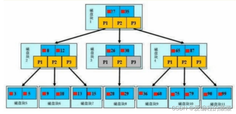 - B树:B树的每个节点包含键和对应的值,叶子节点存储实际的数据记录。B树的内部节点和叶子节点的结构是一致的,节点中的键按顺序排列,并且节点可以存储大量的键值对。
