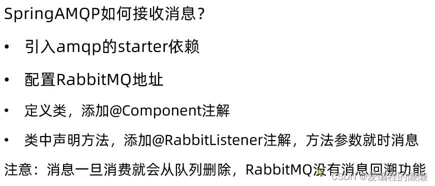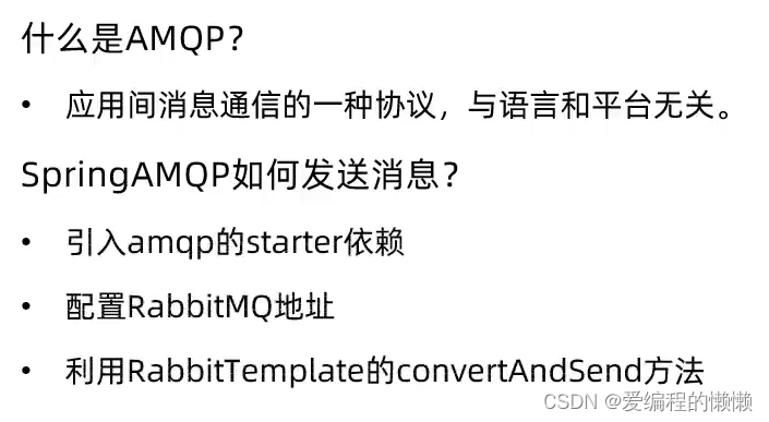 @RunWith(SpringRunner.class) //告诉java你这个类通过用什么运行环境运行 @SpringBootTest /** 它告诉Spring Boot启动一个完整的应用程序上下文,而不仅仅是一个单一的测试类 或测试方法。这个完整的应用程序上下文将包含所有的Spring Bean、 配置和依赖项,这样我们就可以像在实际的应用程序中一样运行我们的测试用例。 */ public class SpringAmqpTest { @Autowired private RabbitTemplate rabbitTemplate; // 用于与 RabbitMQ 消息队列进行交互。它提供了一系列方法来发送和接收消息, // 并处理与消息队列相关的操作。 @Test public void testSengMessage2SimpleQueue(){ //队列名称和消息 String queueName="simple.queue"; String message="你好,啦啦啦!"; //发送消息 rabbitTemplate.convertAndSend(queueName,message); } }