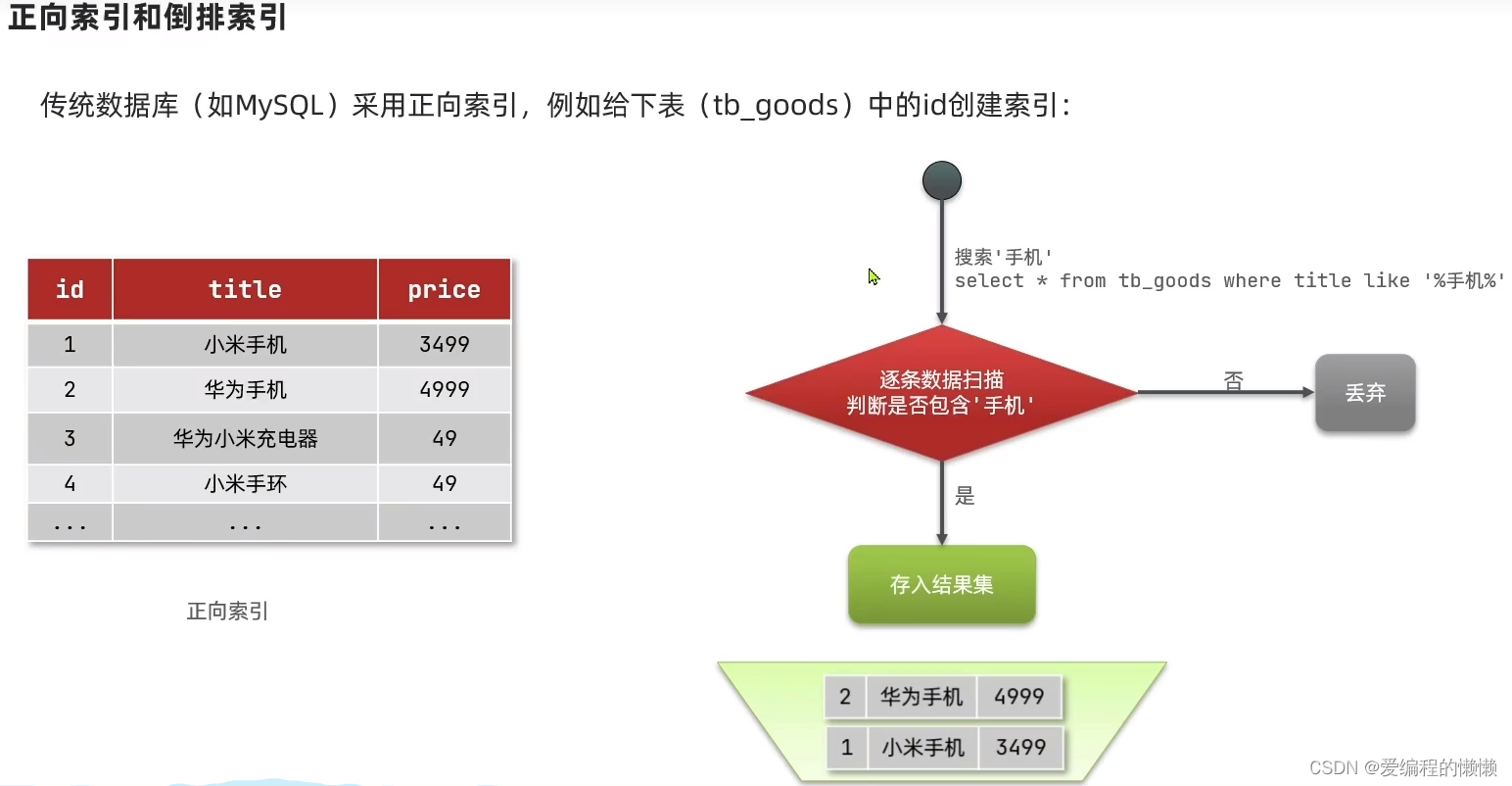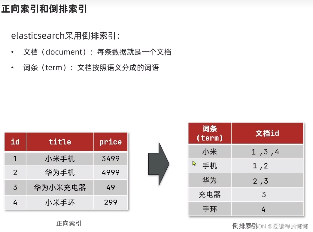 传统的搜索采用正向索引,就是从头到尾进行搜索,但是,采用这种搜索如果数据量过大的话,就会影响效率,因此引入了倒排索引,将每个title的词条分开,放在一起,根据词条进行搜索,这样大大的增加了搜索效率!