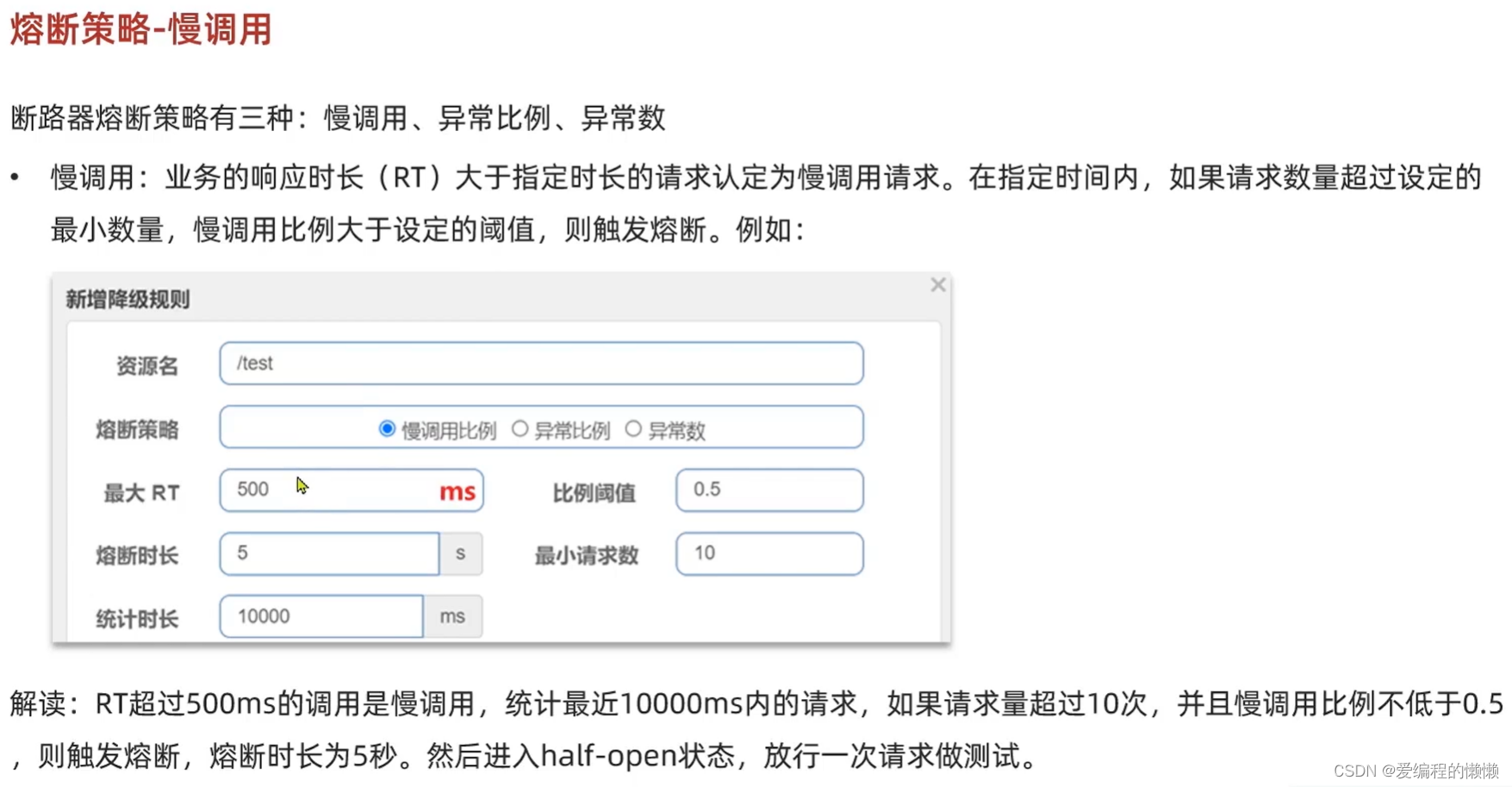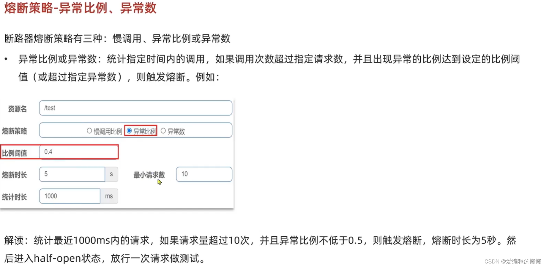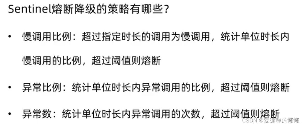 慢调用(大白话):这个调用非常的慢,进而会影响效率,那就直接不用了,进行熔断。 异常比例(大白话):有一个熔断比例值,当错误比例值达到这个比例设定的值时,就会触发熔断 。意思是,太垃圾了,我不用了,直接熔断吧! 异常数(大白话):当请求错误数量达到某个值时,就会进行熔断