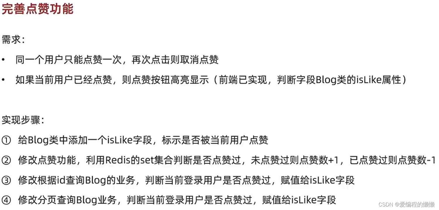 利用redis解决:在redis里面以这个笔记的id为key,记录给这个笔记点赞的所有用户,这里就用到集合了, 这样只用判断,用户id是否在这个集合里面存在即可。既然要点赞,那么用户id不能够重复,即唯一性,这时,我们可以用到set集合来实现。