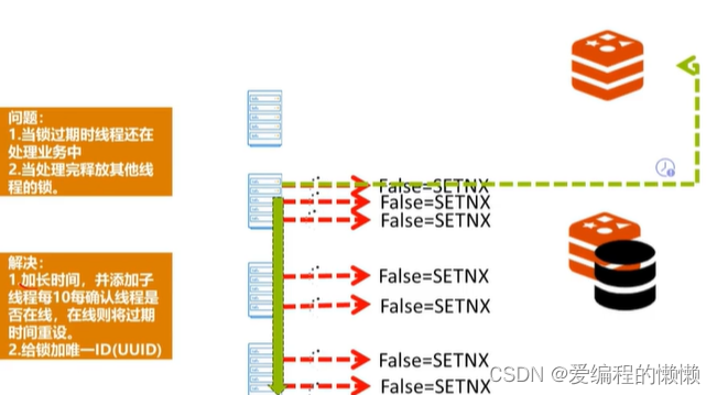 当用户请求进来的时候,通过SetNX来设置一个键,这个键里面没有的时候返回true,加锁成功(这里要加上过期时间,因为用户在请求的过程中的,如果此时服务器挂掉了,那么其他的服务器正常的请求依然会出现一个阻塞的情况。因为其他服务器的线程通过SetNX来进行上锁的时候,会发现这个键当中会一直有值,所以说会永远不会上锁成功,之前挂掉的服务器会一直持有锁,从从而造成一个死锁的现象。加上过期时间,当服务器挂掉了,可以等时间到了之后,进行锁的释放,从而不影响其他服务器的正常请求)。