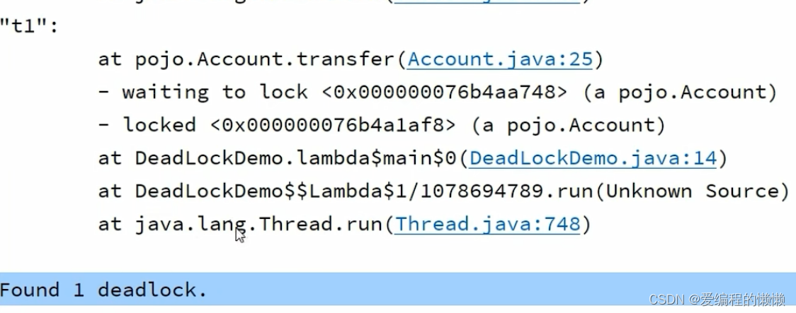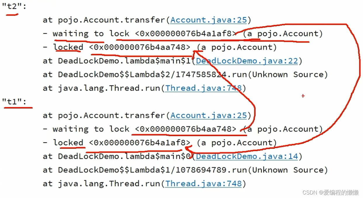 通过控制台提供的信息可以发现,t1等待的资源t2在使用,而t2等待的资源t1在使用。