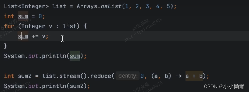 这里的.reduce是将这些整数进行求和,而identity:0是这个累加器的初始值为0,相当于int sum=0,然后讲加后的结果返回给前面的identity,这里的a相当于sum +=v中的sum,b相当与v,然后讲identity的值赋值给a。
