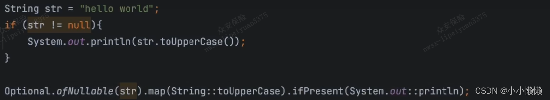 这里的.toUpperCase()是将字母转换为大写,.ofNullable()是判空,.map()是转换类型,这里是转换为大写字母,.ifPresent()是Optional类提供的一个方法,用于在Optional对象包含值的情况下执行指定操作,详细看这篇文章:http://t.csdnimg.cn/3cxU9
