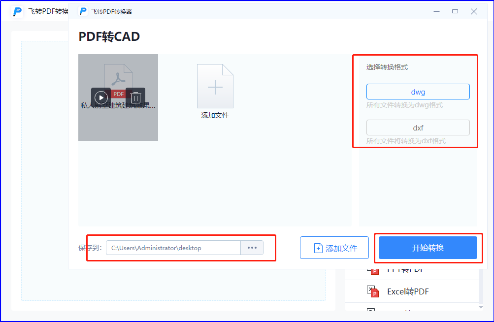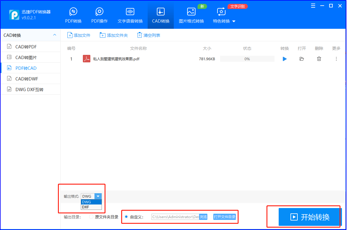 ②.文件添加进来之后,在下方【输出格式】处选择dwg或者dxf格式,选择好之后在正下方设置文件转换后的输出目录,最后点击右下角的【开始转换】按钮,完成转换。