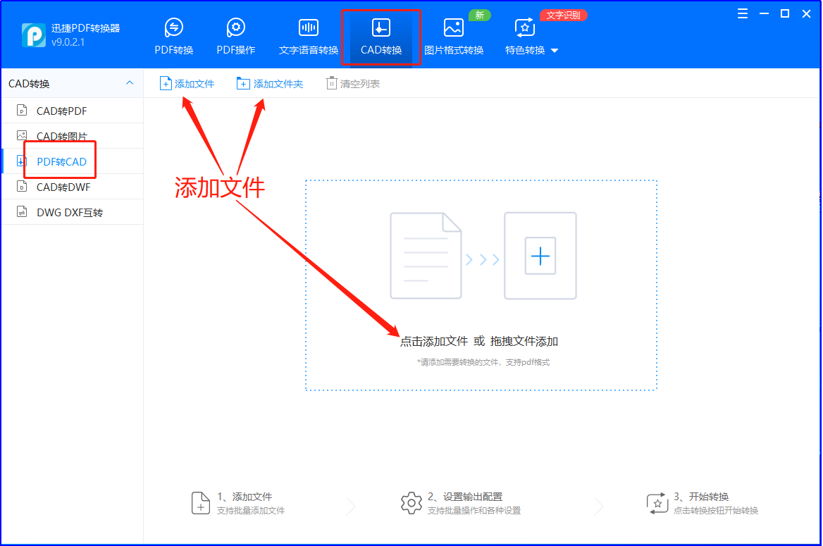 ①.首先打开电脑中的PDF转换器,在上方菜单栏中点击【CAD转换】按钮,接着在左侧选择【PDF转CAD】功能之后在右侧点击【添加文件】、【添加文件夹】或者直接把文件拖拽进来。