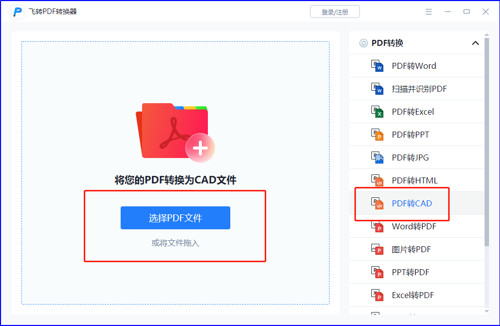 ①.首先打开PDF转换工具后,在右侧的PDF转换中找到【PDF转CAD】,然后添加需要转换的图纸,在左侧点击【选择PDF文件】或者直接把文件拖入至虚线框内添加。