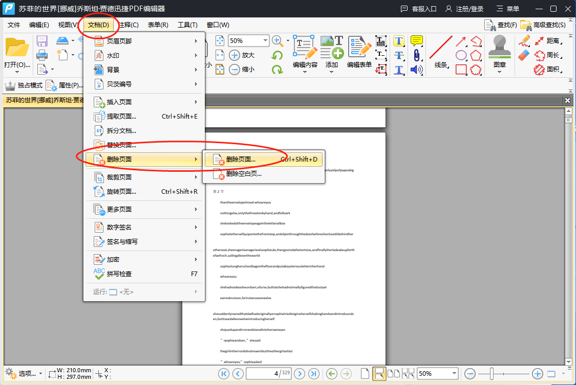 第二步:文件导入之后,我们在上方菜单栏中点击“文档”-“删除页面”功能进入。