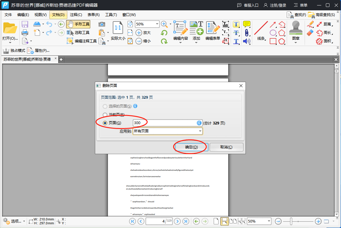 第三步:在弹出删除页面窗口之后,我们可以看点这里有三个选项可以选择“选择的页面”、“当前页”以及“页面”,这里以我自身的体验建议大家确定好页面数,直接输入删除,以免会误删到其他页面,选择好之后点击“确定”即可。