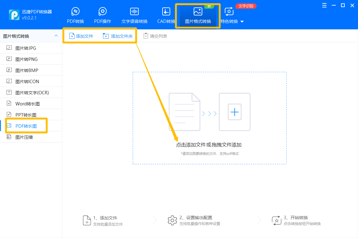 ①.首先在电脑里打开这款PDF转换工具,进入首页之后在菜单栏中点击“图片格式转换”,接着在左侧列表中点击“PDF转长图”,然后在右侧点击将文件添加进来,也可以直接拖入进虚线框中添加。
