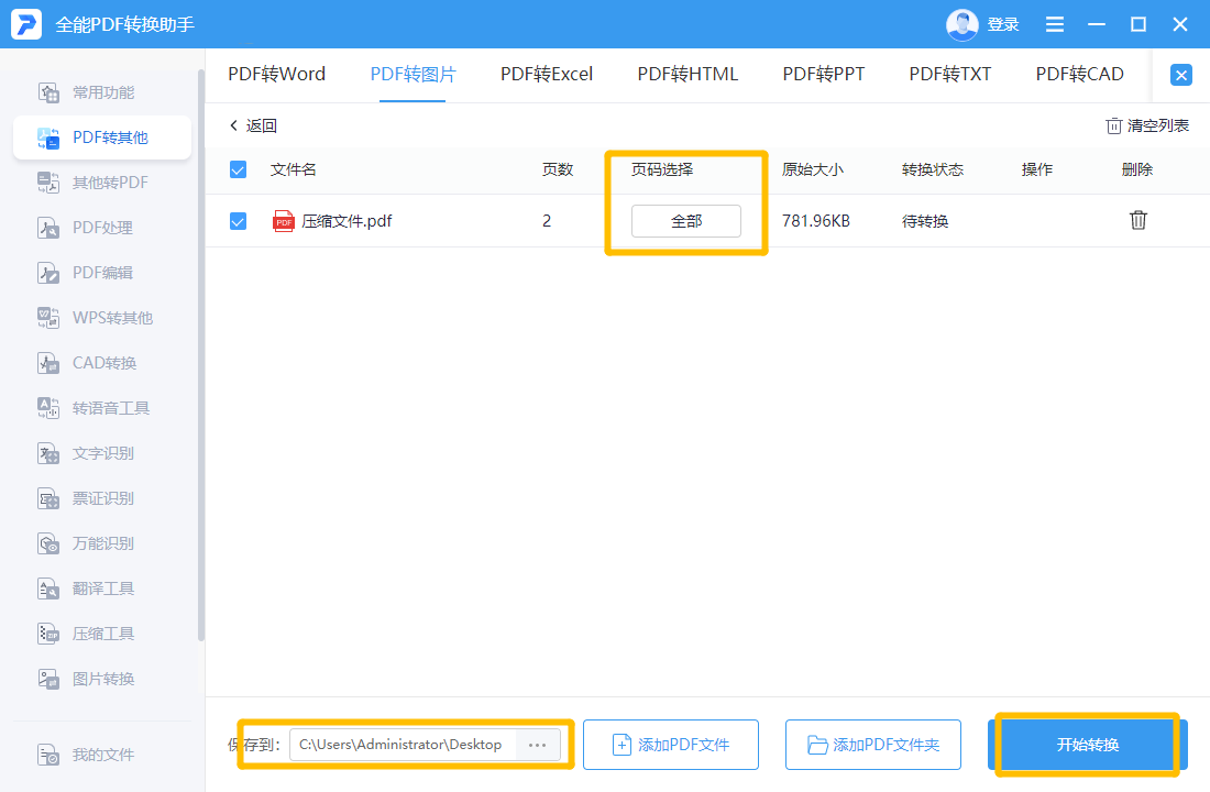 ②.文件导入进来之后,如果不需要全页面转换的话可以在“页码选择”处进行选择,然后在下方设置文件输出目录并点击“开始转换”即可。