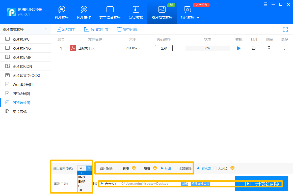 ②.文件添加之后,我们可以在下方根据需求选择是输出的图片格式,以及图片的质量、是否设置水印。设置好之后在下方可以设置文件输出位置,最后点击“开始转换”按钮,即可。
