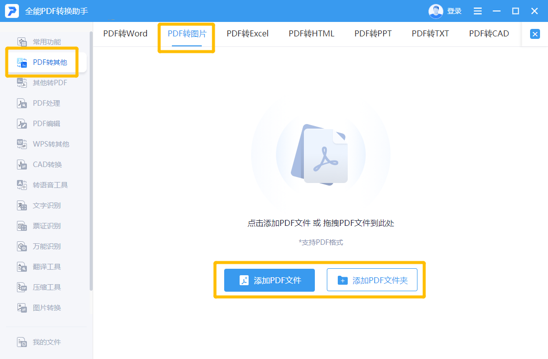 ①.首先打开这款转换助手工具,在首页功能中点击“PDF转其他”-“PDF转”,然后在下方点击“添加PDF文件”按钮导入。
