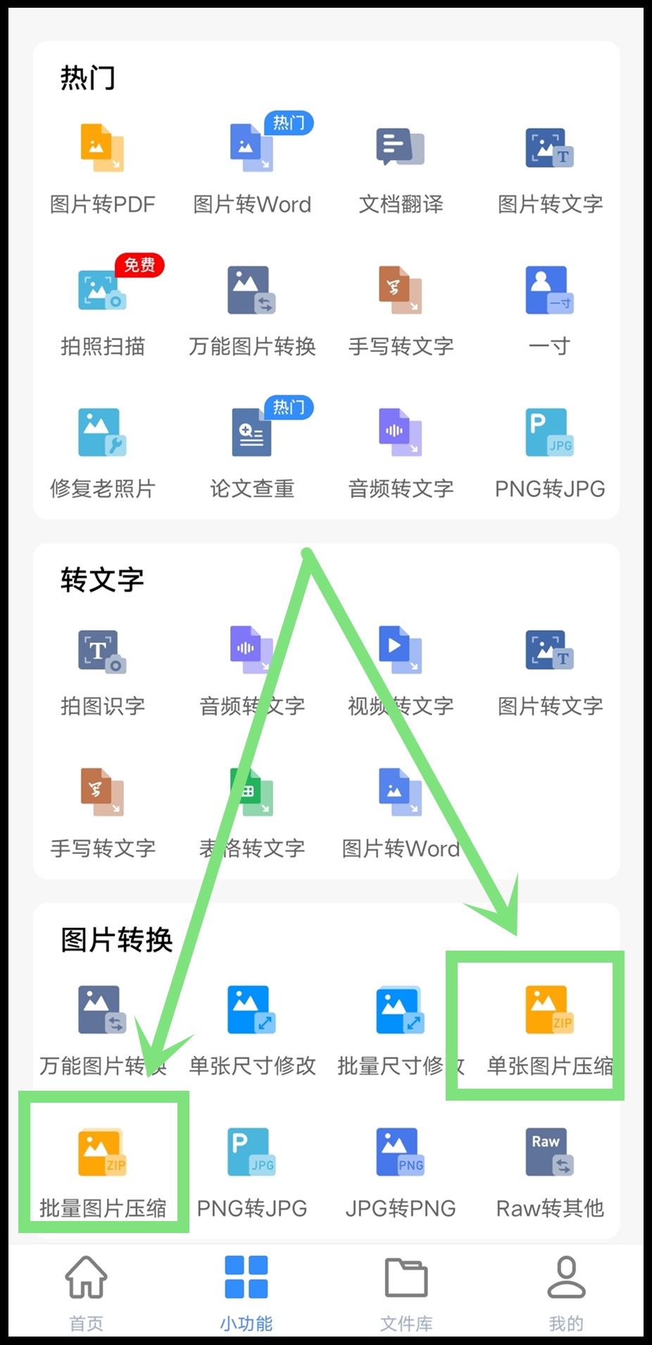 第二步:进入小功能页面后,在“图片转换”功能板块中根据压缩图片的数量点击“单张图片压缩”或者“批量图片压缩”。(这一步点击之后应用会拉起手机的储存空间,如果手机不能正常拉出手机储存页面的话应该是因为没有进行储存授权,只要授权一下就可以了。)