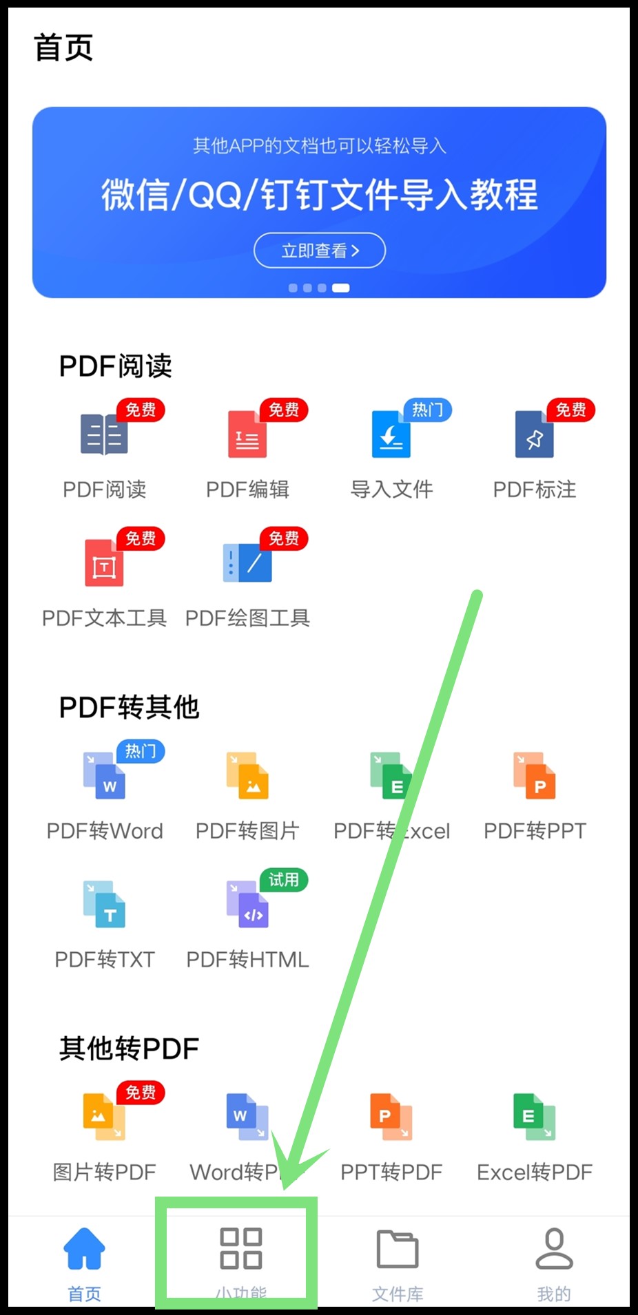 第一步:首先我们打开手机的应用商城,安装这款PDF转换工具,进入后,在首页下面点击导航栏第二个图标“小功能”按钮。