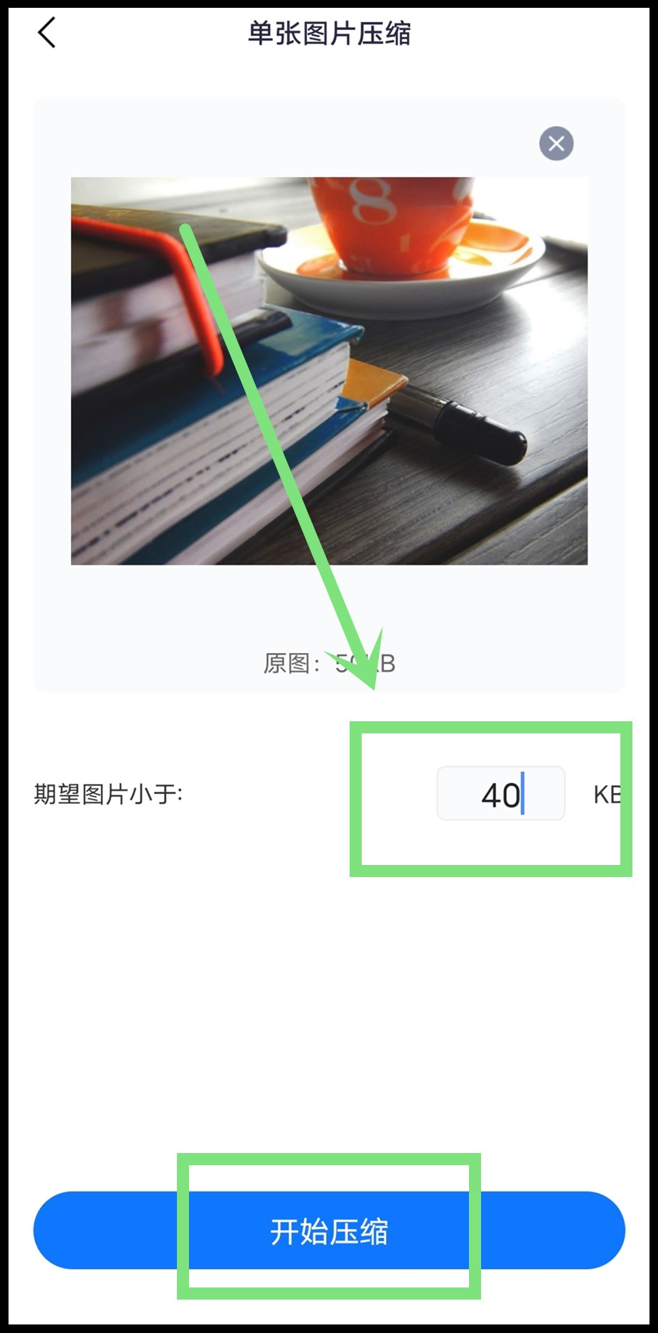 第三步:需要压缩的图片导入近来之后,我们可以看到该图片的原占用内存情况,然后我们在“期望图片小于”处填写想压缩到的数值。最后点击下方的“开始”按钮就可以完成操作了。是不是非常简单呢~