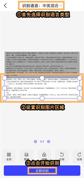 ③.图片导入进来之后,点击顶部的“识别语言”处设置需要识别的语言类型,接着在图片上截取需要识别的范围,如果需要全图识别则可以不用进行截取,最后点击底部的“立即识别”按钮完成操作。