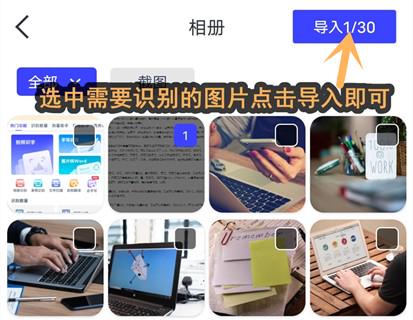 ②.如果图片已经储存到设备,直接拉取处相册中的图片,点击选中需要识别的图片,接着点击右上角的导入按钮完成操作。