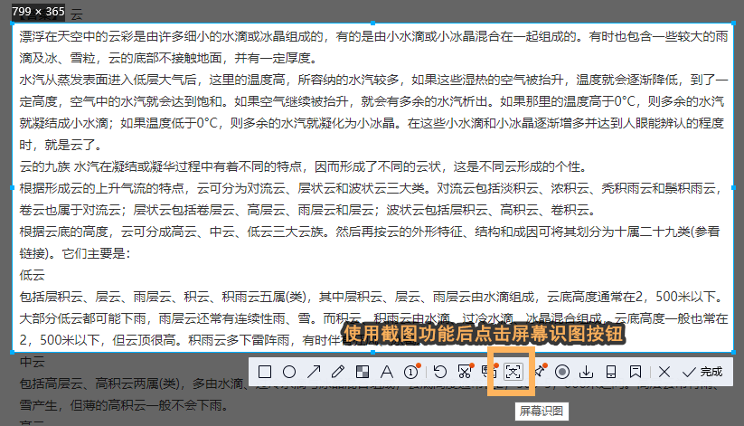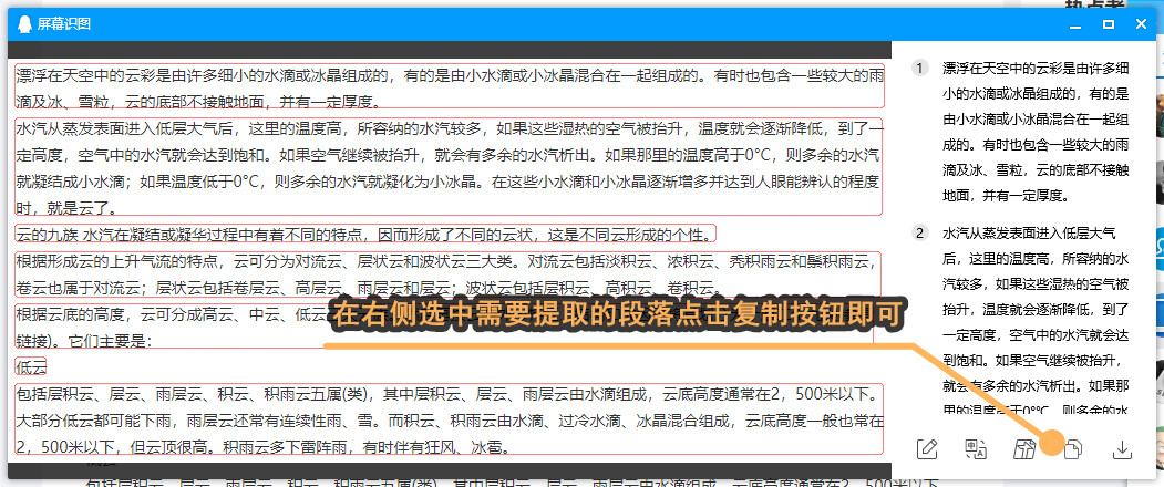 ②.进入屏幕识图功能后,在右侧会识别出截取区域的内容,选中需要复制的段落并点击复制图标即可。