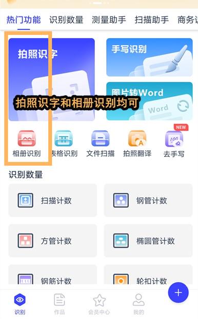 ①.在设备中打开这款识别应用,在首页可以根据图片时需要拍照还是已经存储到本地设备来点击拍照识字或者相册识别功能进入。