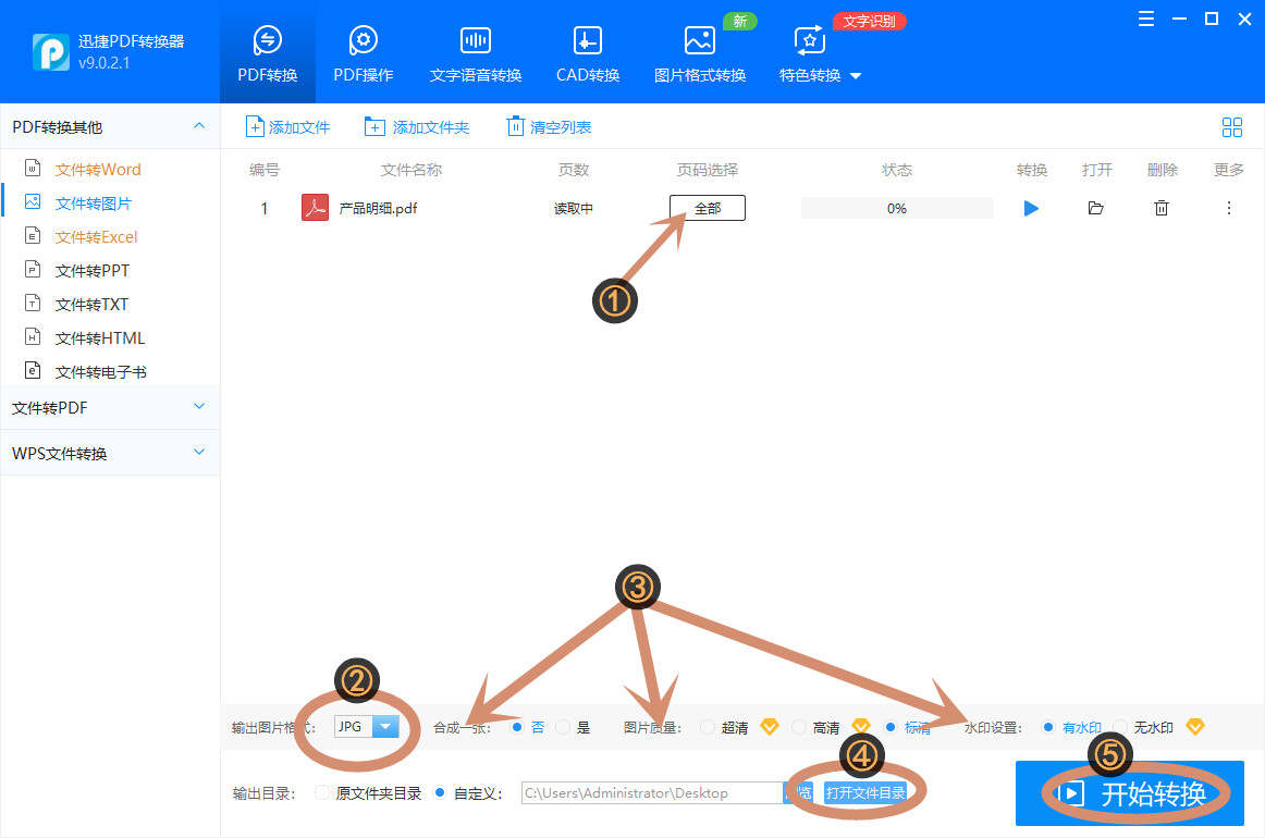 ②.文件添加进来之后首选选择需要转换的页码,接着设置转换后图片的格式以及是否需要将页面都合并到一张图片以及图片的质量是否需要加水印,接着设置文件输出的目录并点击开始转换完成操作。