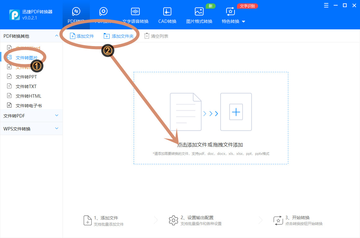 ①.首先在电脑上打开这款PDF转换工具,进入工具首页后在左侧PDF转换其他的功能选项中选择文件转图片,接着在右侧上方点击添加文件或者添加文件夹,也可以将文件拖入到虚线范围内添加。