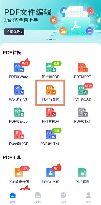 ①.如果在没有电脑可以操作的时候,手机上也是可以转换的,打开这款PDF编辑应用,进入后在PDF转换专区中选择PDF转图片进入。