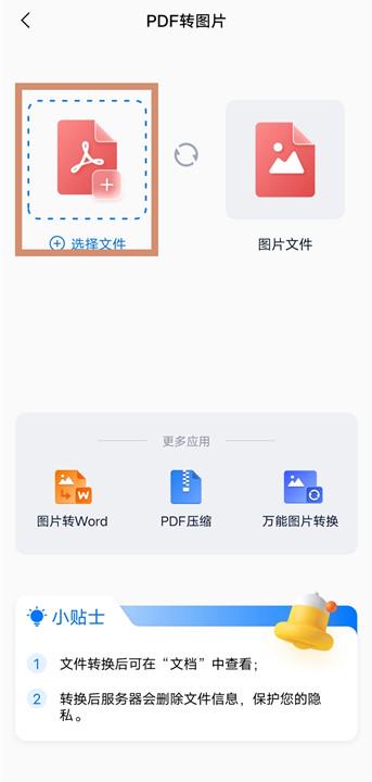 ②.进入PDF转图片页面后,点击左上方的选择文件按钮,将文件添加进来之后就可以进行图片转换了。