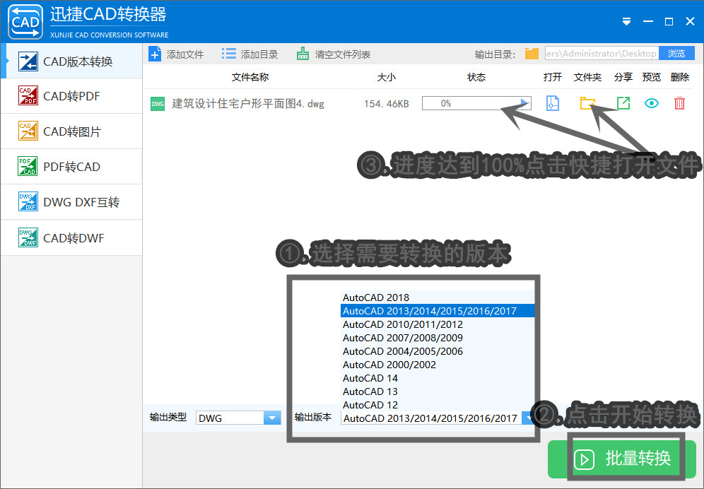 ②.文件添加进来之后,在下方的输出版本处选择正在使用的CAD工具版本,选择相匹配的版本之后就可以点击右下角的“批量转换”按钮完成转换操作了,等到状态栏达到100%之后就可以点击后方的文件夹图标快捷打开输出文件位置了。