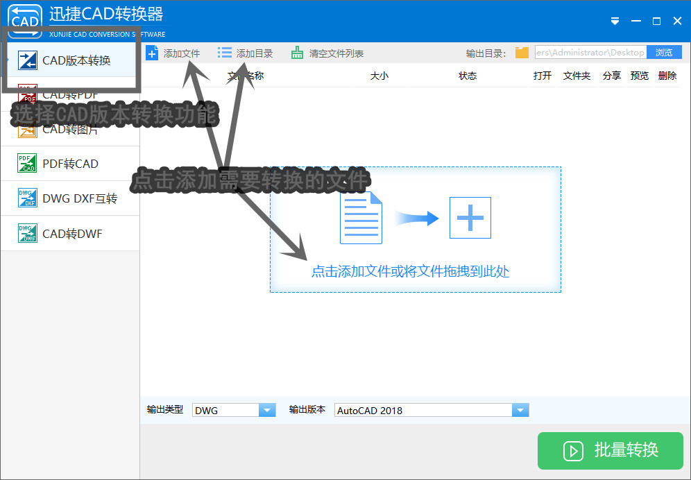 ①.首先在桌面打开这个CAD转换工具,进入后在左侧的列表中可以看到众多功能,在这里选择CAD版本转换功能,接着在右侧可以点击“添加文件”、“添加目录”或者拖动文件进虚线范围内添加,可以根据个人习惯以及文件数量来决定。