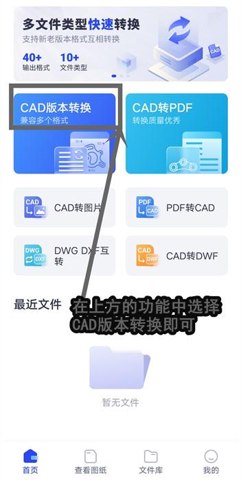 如果在出差或者没有电脑使用的时候我们仍可以在手机上打开同款转换应用,进入后就能看到左上角第一个功能就是CAD版本转换了,在这里就可以进行转换操作了。