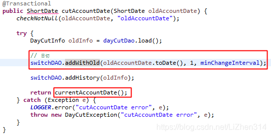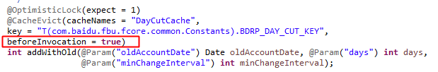 (3)在进行日切日期更新前,会先清空缓存(注:CacheEvict的beforeInvocation参数设置为true,表示在方法执行前清空缓存,默认为false)。