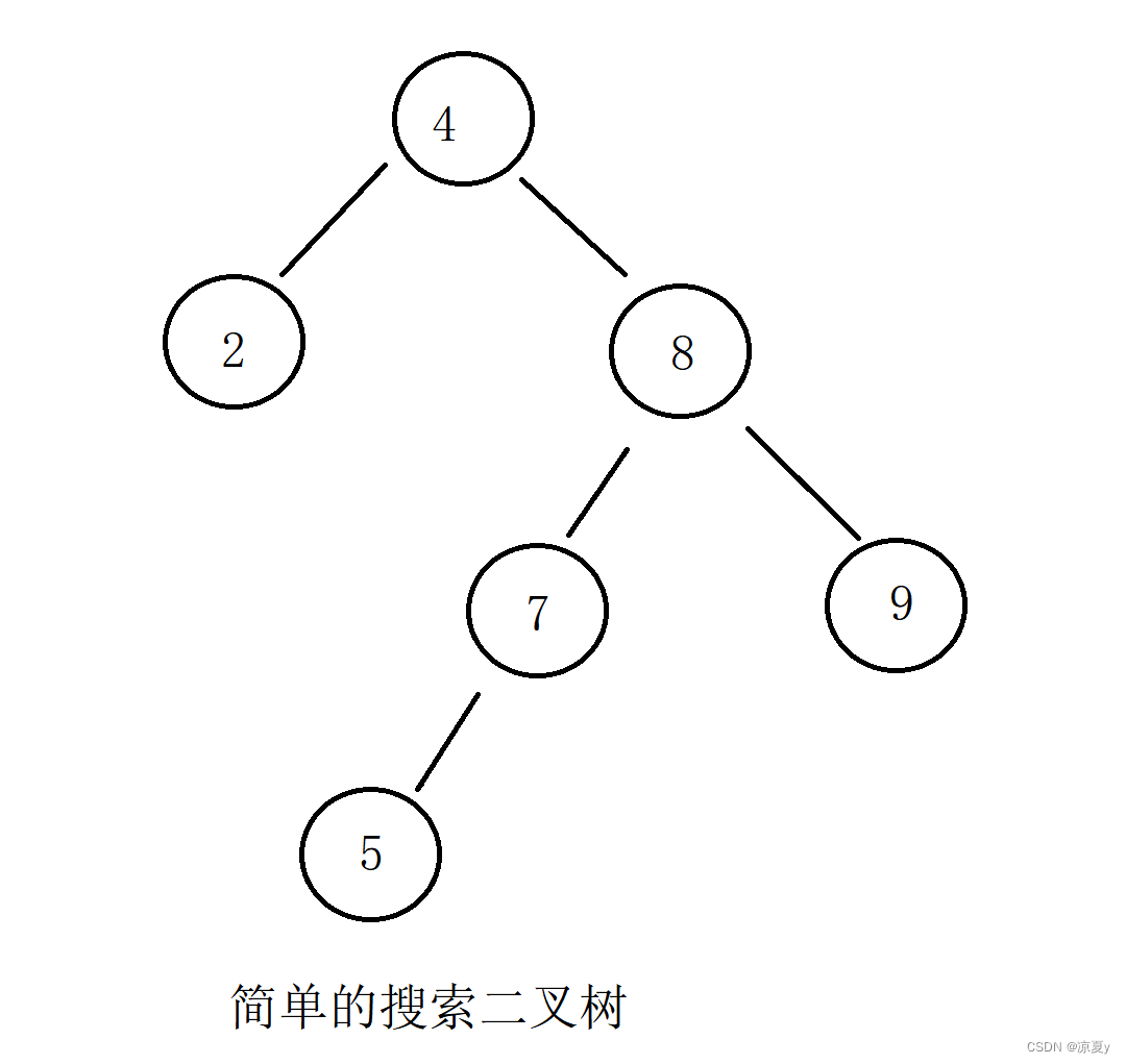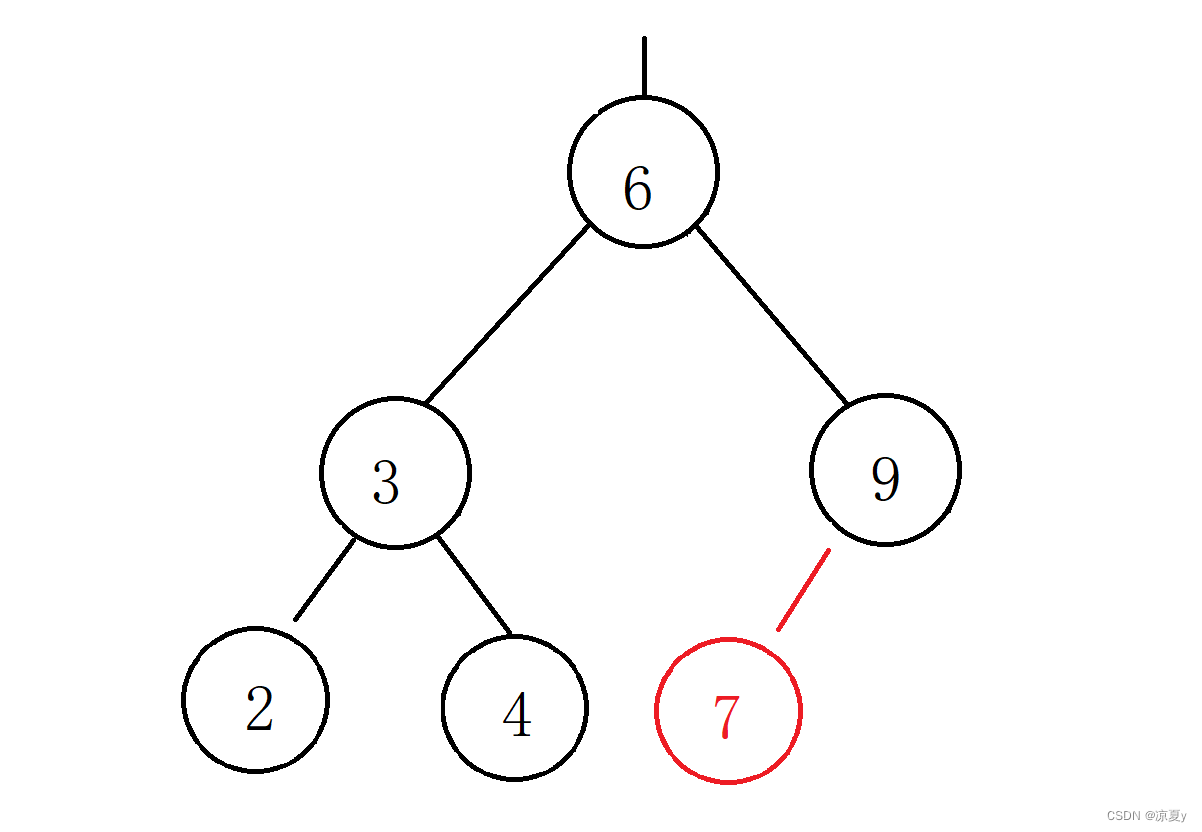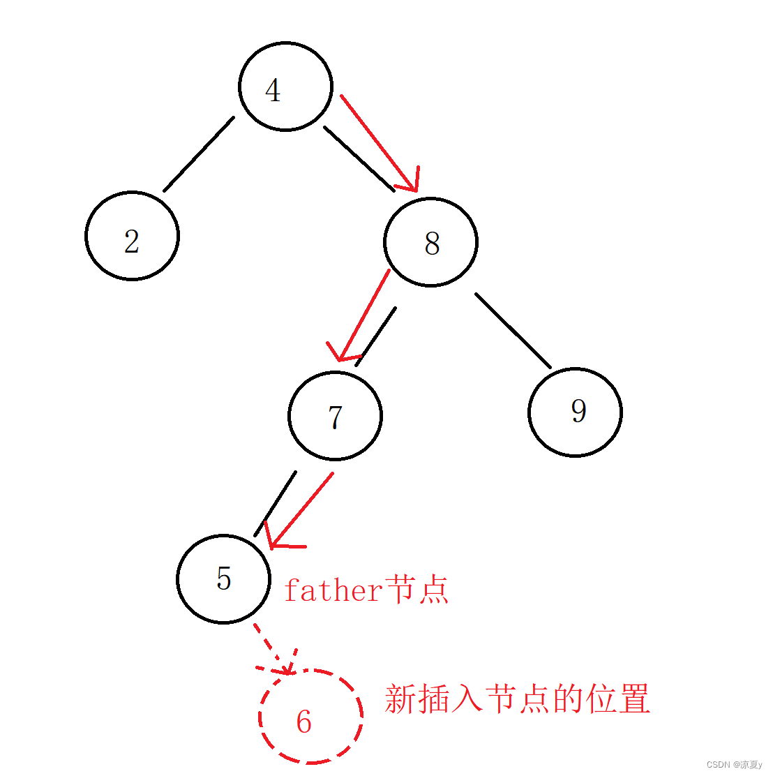 例如对下面这样一颗二叉树插入6,那么最终father指向5,cur为空