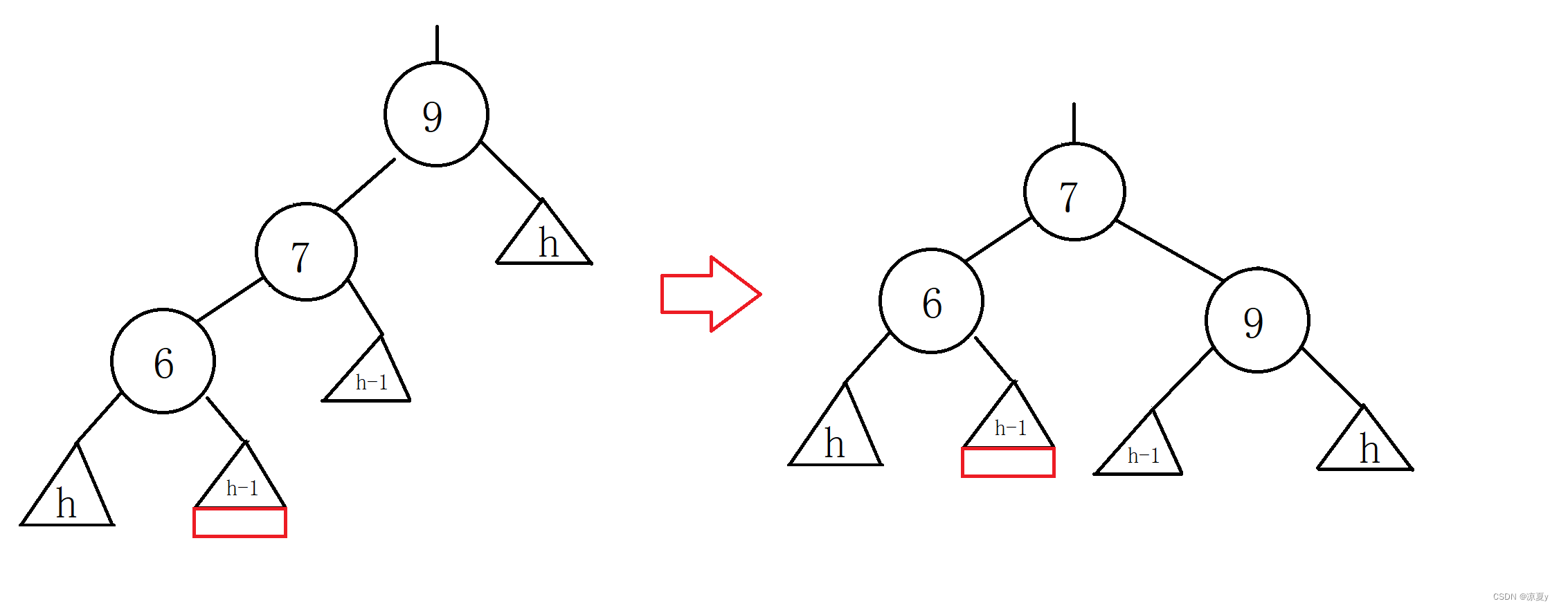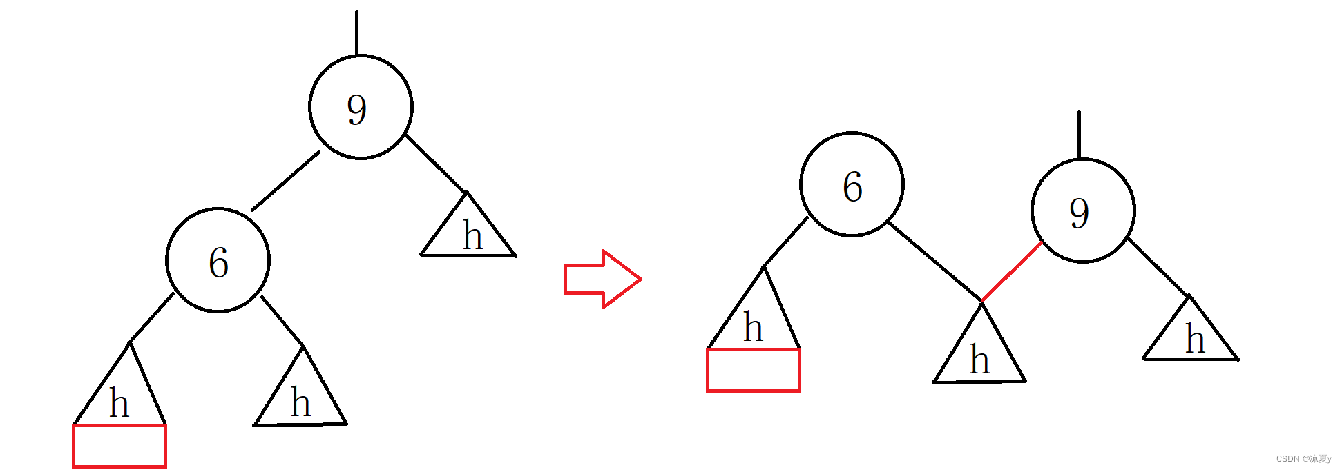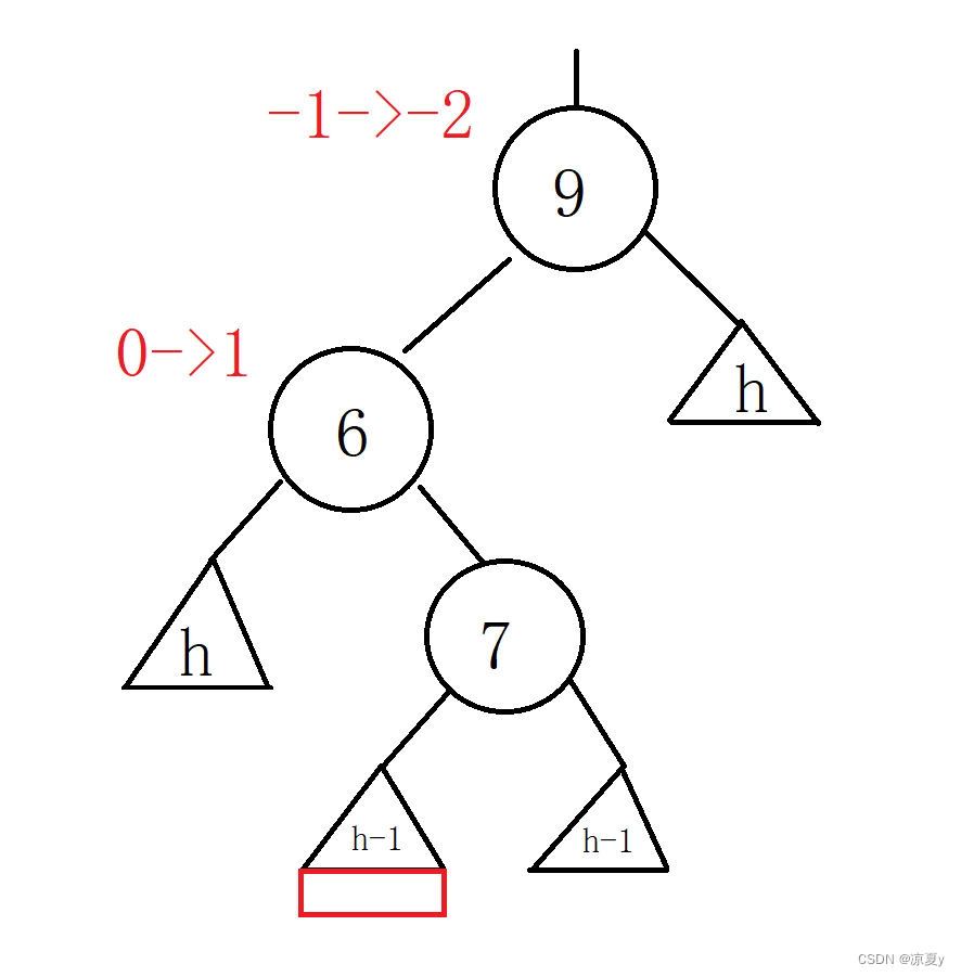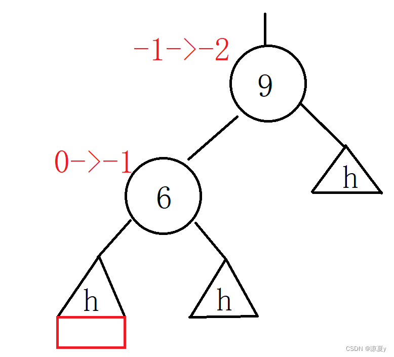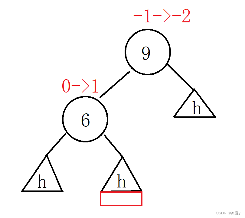 9的右子树高度为h,左子树在插入之前高度为h+1,而在6的左子树上插入之后,6的平衡因子更新为-1,9的平衡因子更新为-2,此时我们进行如下处理即可。