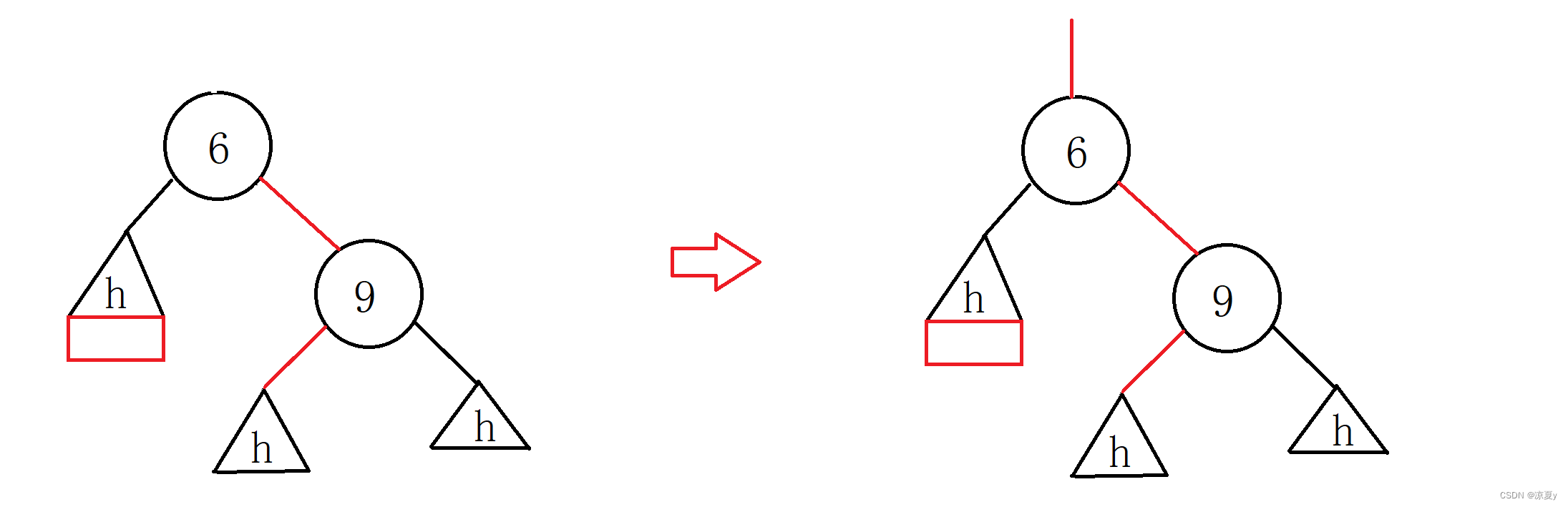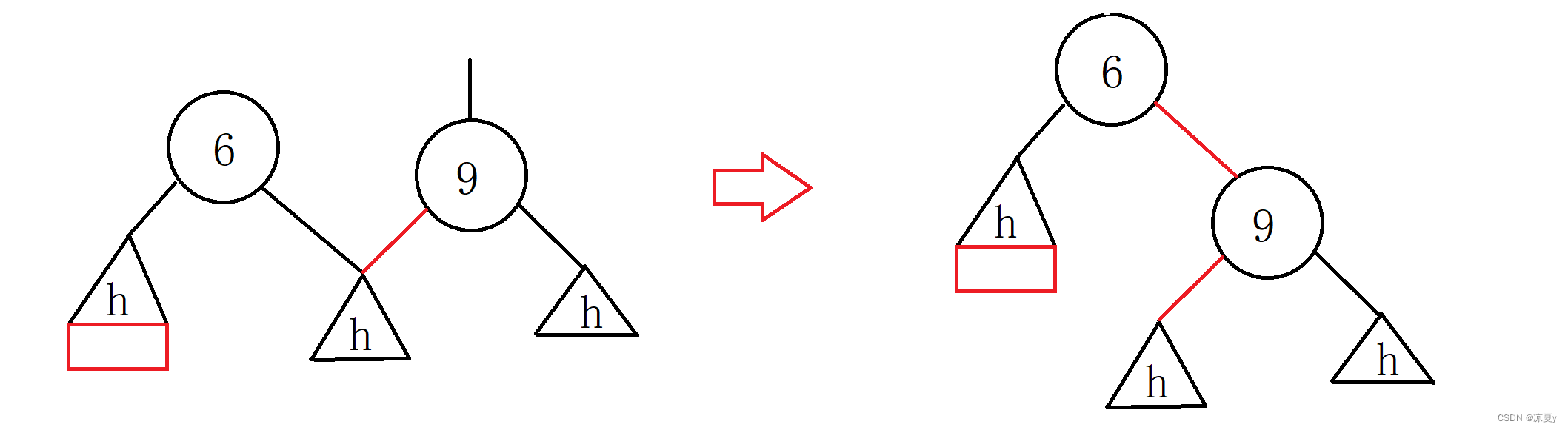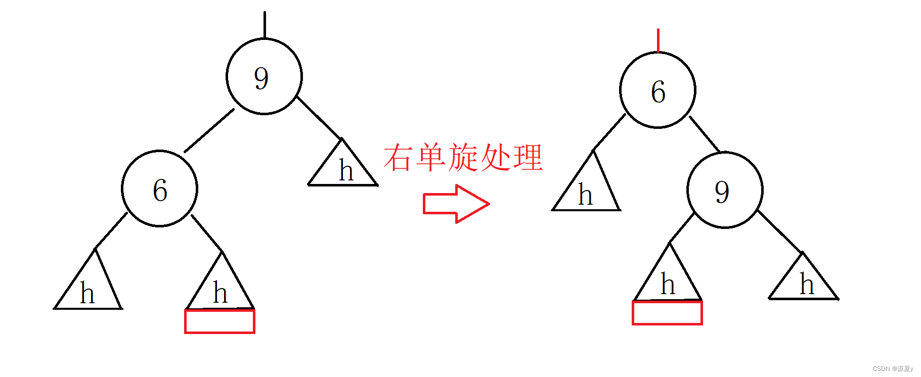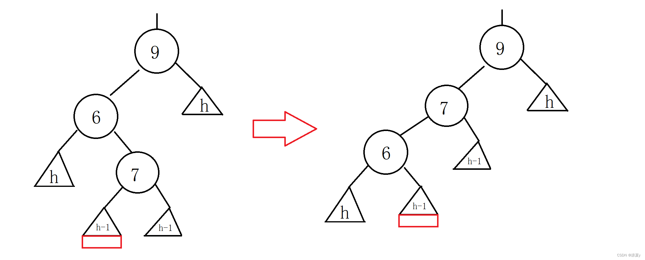 9的右子树高度为h,左子树在插入之前高度为h+1,而在6的左子树上插入之后,6的平衡因子更新为-1,9的平衡因子更新为-2,此时我们进行如下处理即可。